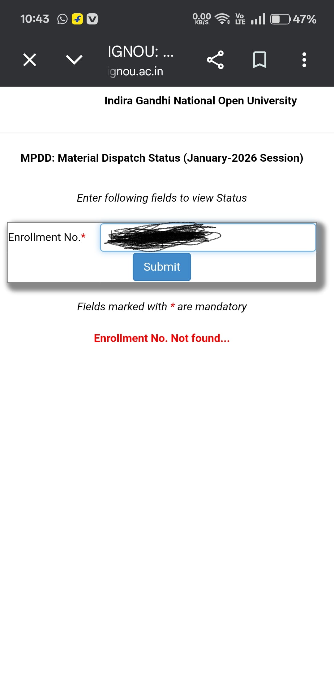 When i click student study material option now enter my enrollment no. That showing. Enrollment number not found. How to order study material. And how to know the dispatch status.